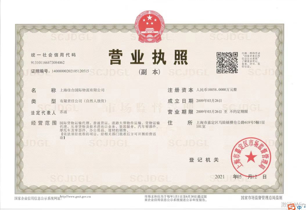 【標(biāo)題】上海佳合國際物流有限公司注冊資本10058萬,大型貨物運輸資...查看詳情>>>